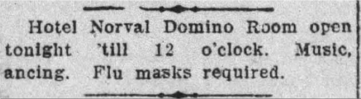 After the Surgeon General recommended mask-wearing in September 1918, Red Cross volunteers across the country produced identical gauze face coverings. Mask requirements were inconsistent by town. Boulder Springs, Colorado fined $100 to “any one caught not wearing a facial adornment in the form of a mask” as reported in The Anaconda Standard local newspaper. Yet in an Indiana town, children at school were exempt from mask-wearing. Private businesses also mandated masks. For example, Lima, Ohio’s Hotel Norval Domino Room advertised music and dancing in the local paper, stating, “Flu masks required.” While most hospitals required masks, Brooklyn’s Kings County Hospital banned employees from wearing them, even when cases rose among its nurses and doctors.