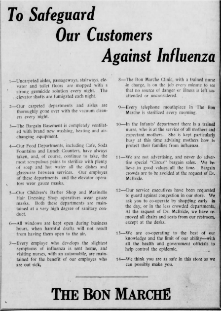 As cases rose, most towns and cities closed theaters, pool halls, and other businesses, banned dances, concerts and gatherings, and discouraged crowding in public spaces. But even this was inconsistent. Minneapolis, Minnesota closed down. Across the river, the city of St. Paul stayed open. Responses across schools also diverged, as school boards held special meetings, debating the best way to proceed. According to Alexandra Stern, Martin Cetron, and Howard Markel, most schools closed for periods up to fifteen weeks. However, Chicago, New York, and New Haven were among the cities that remained open, using medical inspection and individual quarantine to reduce transmission. Businesses that remained open marketed their adherence to safety protocol. At the end of October in 1918, Seattle’s Bon Marché department store took out full-page ads to lay out precautions taken against influenza, which included masks on the salon employees, the removal of chairs in restrooms, and a trained nurse on staff in the infants’ department “advising mothers how to protect their families from influenza.”