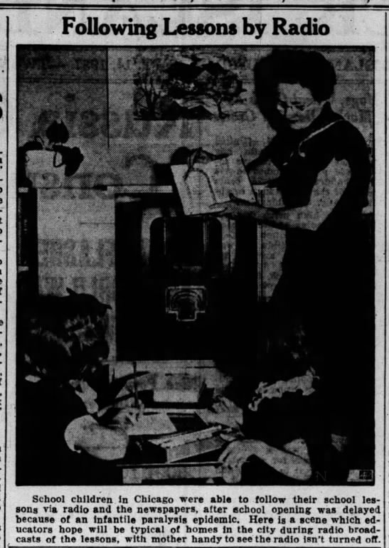 In the summer of 1937, a polio epidemic erupted. On August 31, 1937, the Board of Health in Chicago ordered the start of school to be postponed due to the record number of polio cases (109, just for August). Instead of just keeping kids at home, a “radio school experiment” was launched, led by Assistant Superintendent Minnie Fallon. She worked with 14 principals to design the curriculum for 317,000 children in grades 3-8. (It was decided that those in lower grades might not do as well with radio learning).